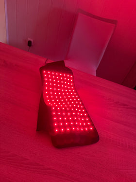 Matte um die gewünschte Stelle legen (z. B. Rücken/Bauch). LED-Seite zur Haut, schwarze Stoffseite außen. Locker anlegen, dann bequem ausrichten.